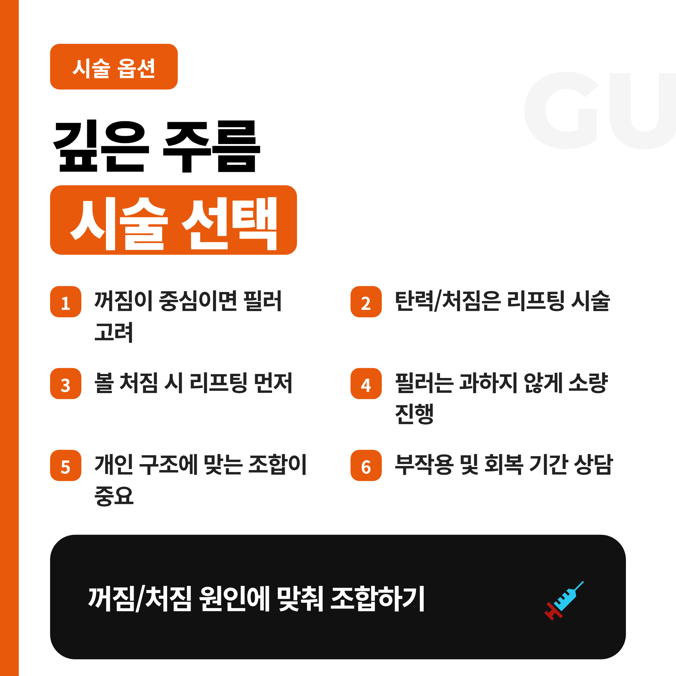 다섯째 깊은 주름은 필러와 리프팅 계열을 조합하면 효과가 좋아요